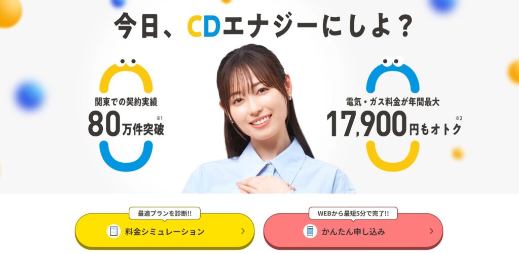 | CDエナジー | ・電気使用量が少ない一人暮らしでも安い! ・豊富なプランからぴったりのプランが見つかる ・現住所から乗り換えるなら圧倒的におすすめ! |