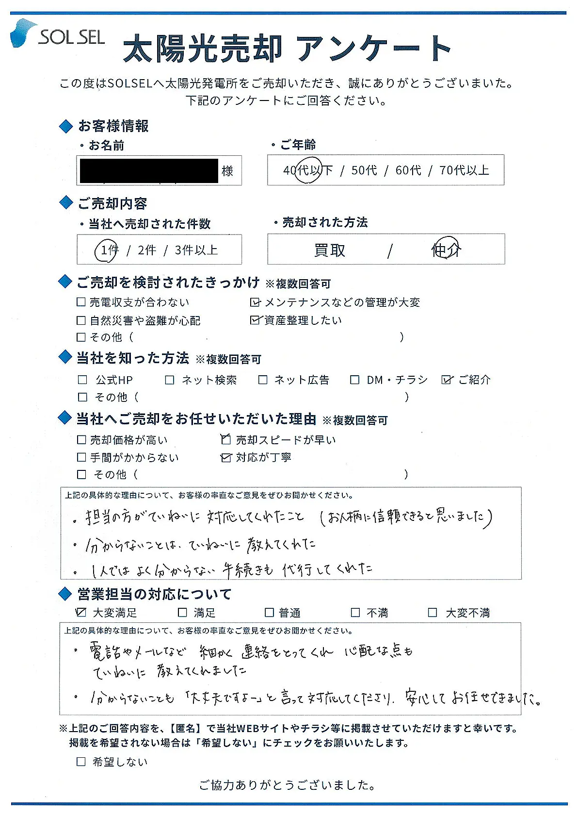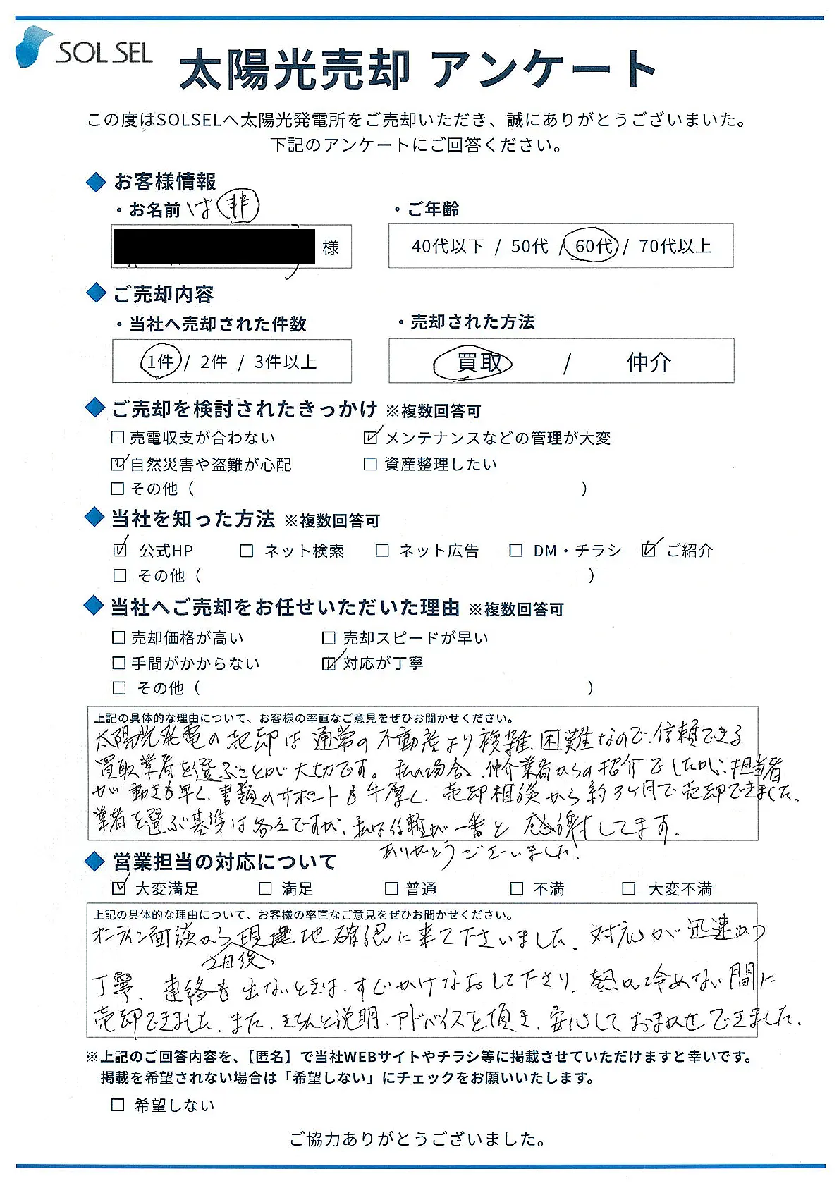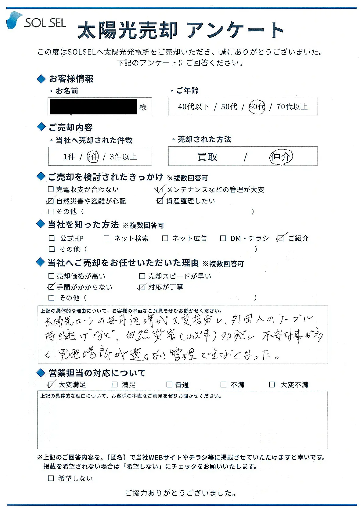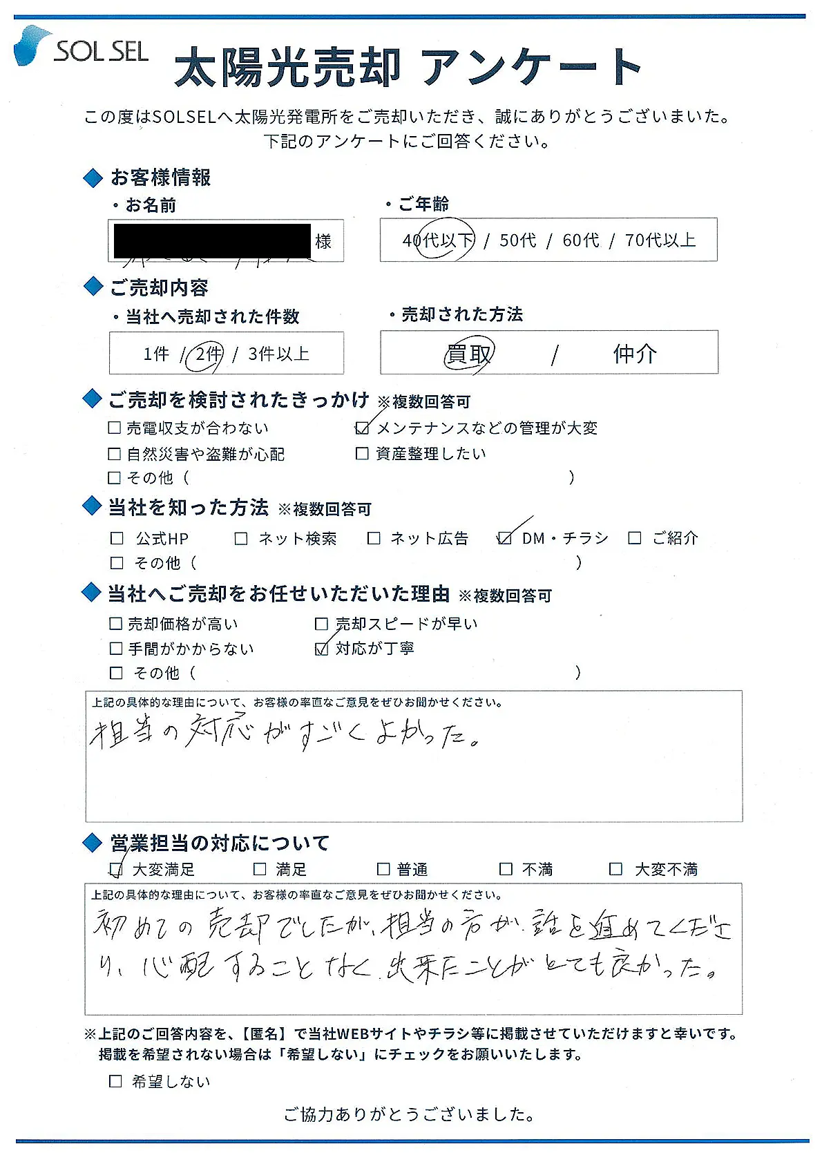 いくつかの会社に査定をお願いしていましたが、ソルセルが一番金額が高かったのと、やりとりがスムーズなことが決め手となり売却を依頼しました。