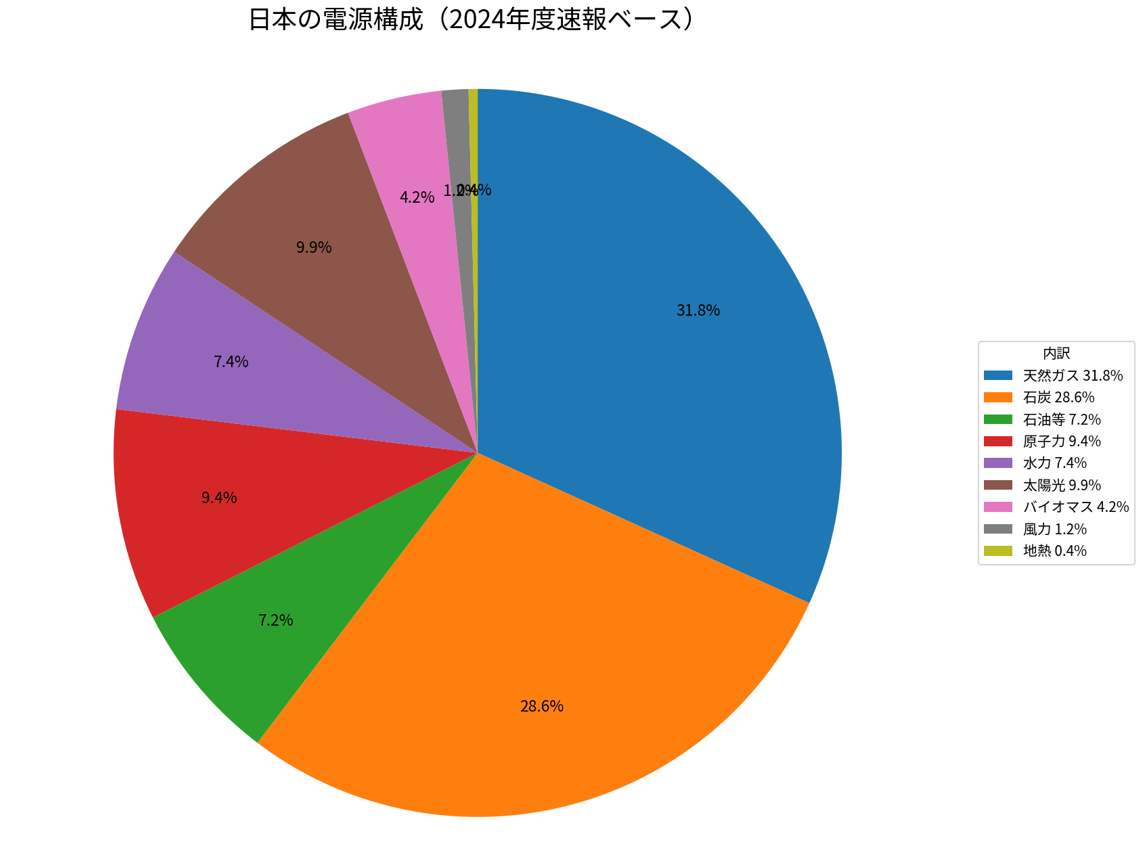 2024年度の日本の電源構成は、再生可能エネルギー(水力を含む)が23.0%、原子力が9.4%となり、非化石電源は合計32.5%まで上がっています。火力(バイオマスを除く)は67.5%で、依然として電力の中心を占めています。