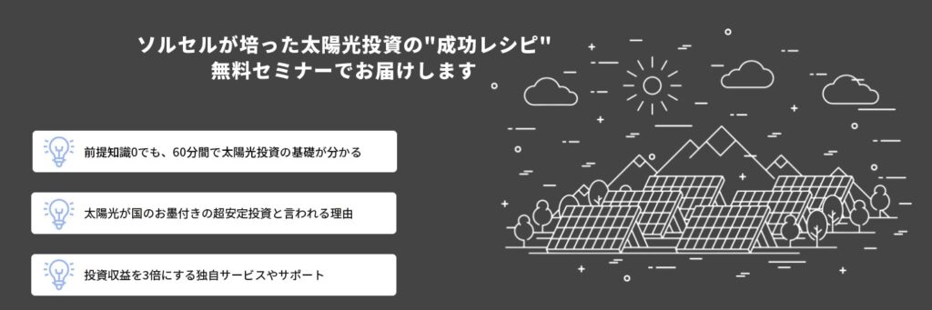 SOLSELでは、気軽に受講できる太陽光投資セミナー(参加費無料)を用意しており、気軽に太陽光投資について学べます。