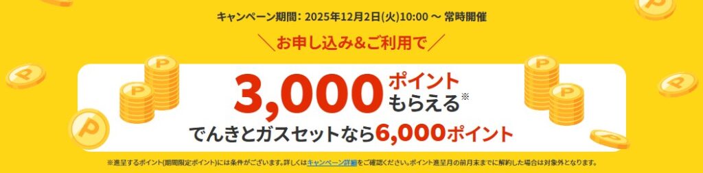 対象となるには、利用開始月+翌月の電気料金合計が6,000円以上で、5カ月目末日まで継続利用する必要があります。